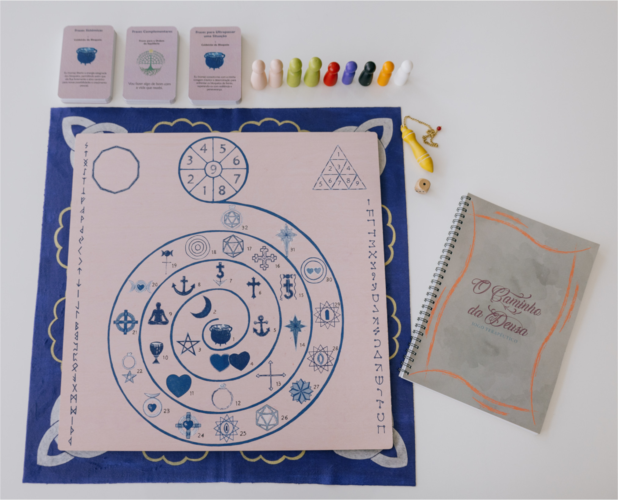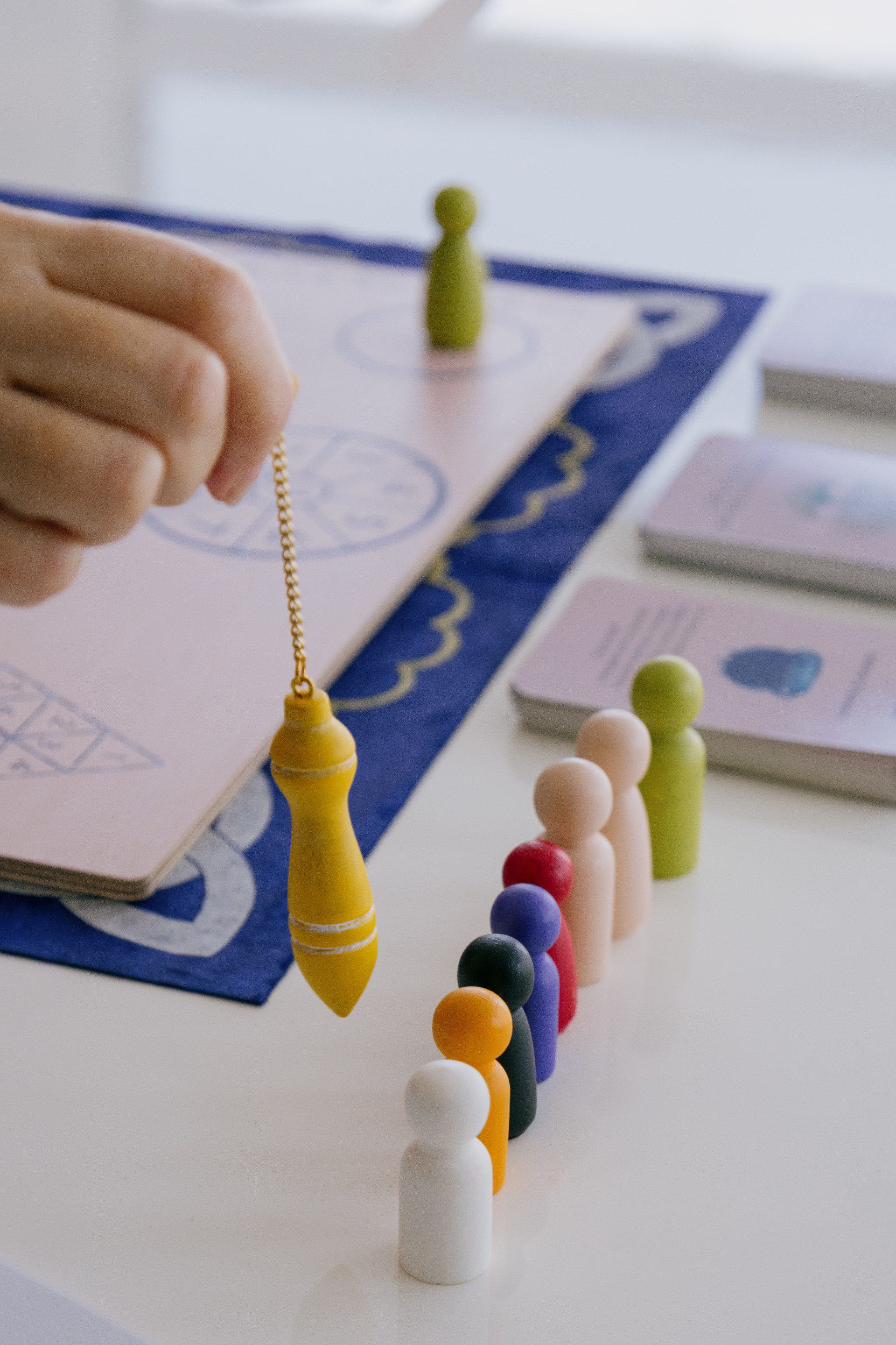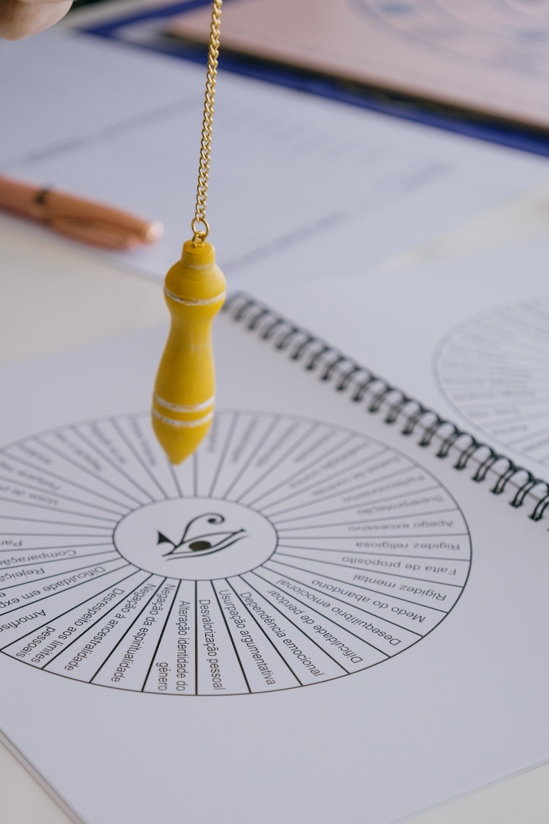 Pêndulo de madeira pintado à mão Um instrumento especial para auxiliar nas leituras energéticas, essencial para orientar o participante no percurso do jogo.