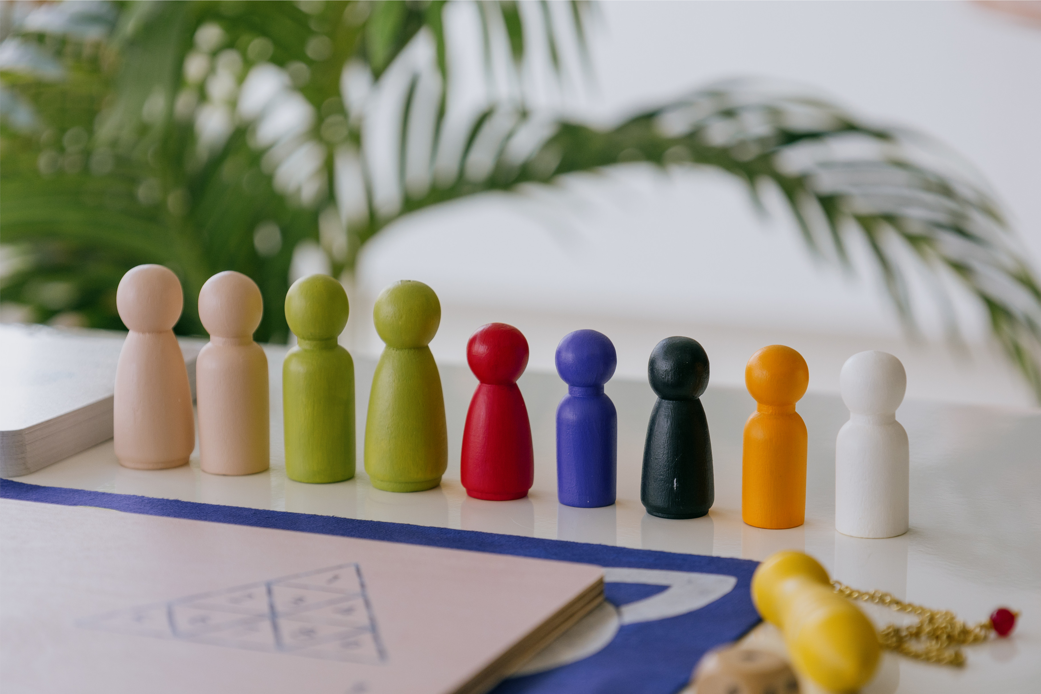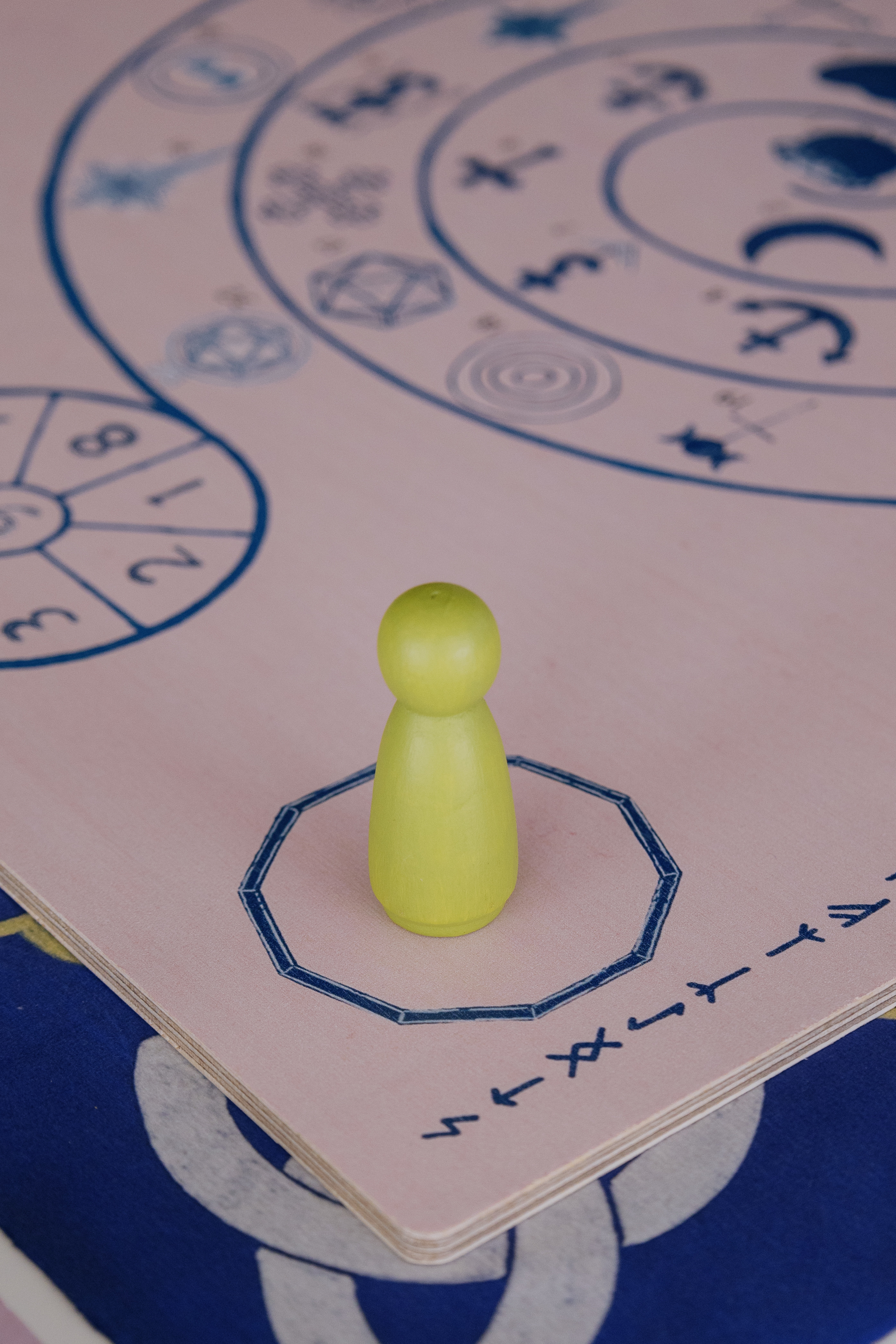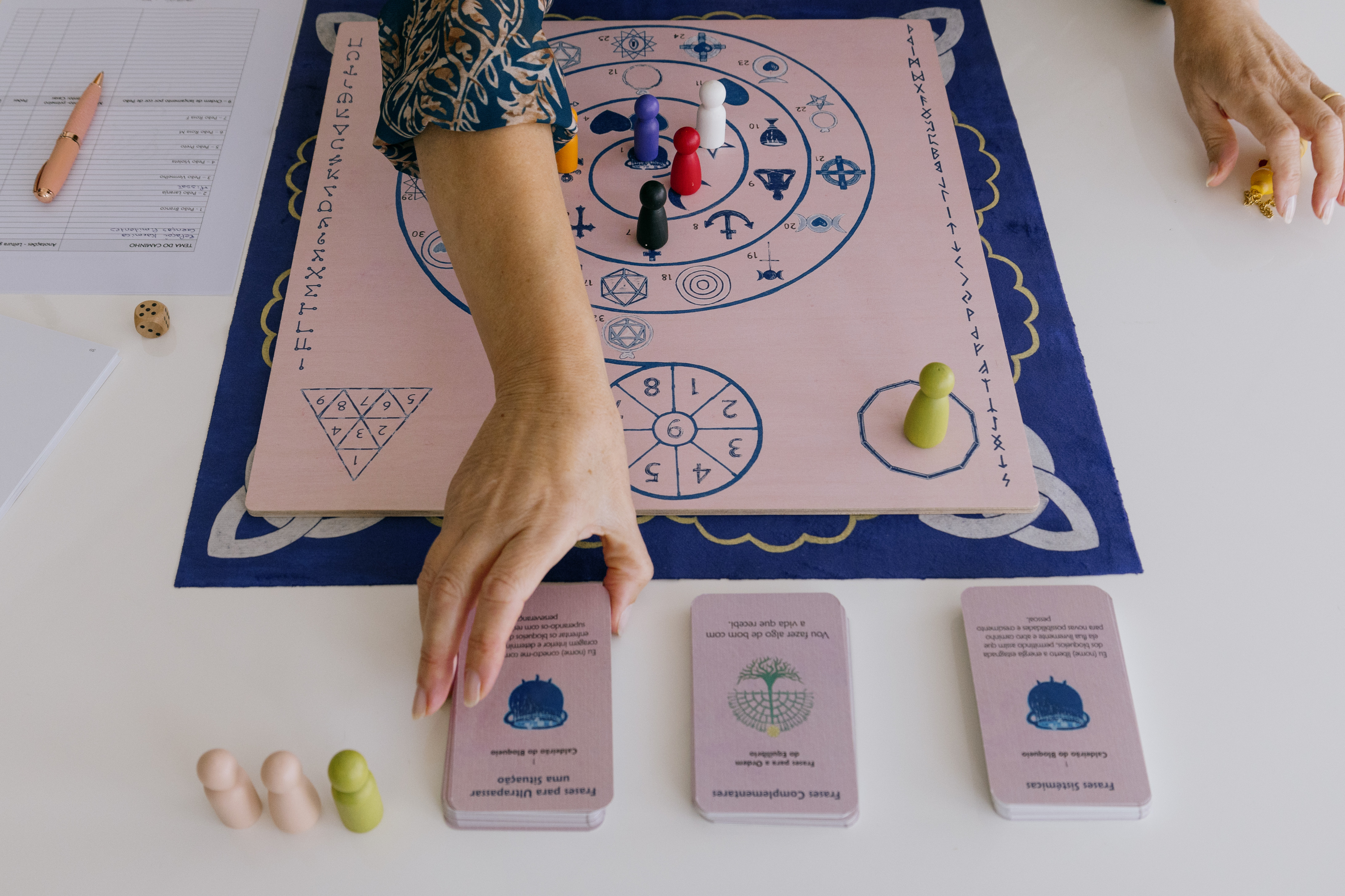 Pêndulo de madeira pintado à mão Um instrumento especial para auxiliar nas leituras energéticas, essencial para orientar o participante no percurso do jogo.